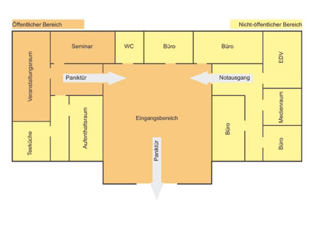 Die Beurteilung, ob für Gebäude mit großen Menschenansammlungen (Veranstaltungshallen, Kinos, usw.) besondere Vorkehrungen für die Flucht im Gefahrenfall zu treffen sind, berührt in erster Linie den Kunden- bzw. Publikumsschutz. Sowohl die Notausgangsverschlüsse mit Drücker und Stoßplatte (ÖNORM EN 179) als auch die Paniktürverschlüsse mit horizontaler Betätigungsstange (ÖNORM EN 1125) erfüllen die Anforderung des § 20 Abs. 1 Arbeitsstättenverordnung (AStV), BGBl. II Nr. 368/1998.